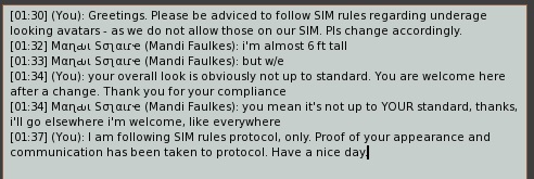 Hello, One of your staff, a furry who's name I do not recall, explained to me that my avatar did not look old enough. I left voluntarily, but he has apparently placed me on your automated ban list. I have been in SL for 18 years, and my avatar, while slender and with a small but reasonably sized female chest, is *always* 18+, both in my profile and in my play. I'm disappointed that I was categorized for "AGEPLAY", since I *never* ageplay. I'm including a screen shot of my avatar and height for your review. I believe your staff member is excluding more slender avatars out of ignorance or his own taste. My avatar's height is the same as many of the other avatars that I routinely see there, so I can only assume it's that I have a slender stature. He did not specify what he found wrong with me. Thank you for your consideration. mandi faulkes
